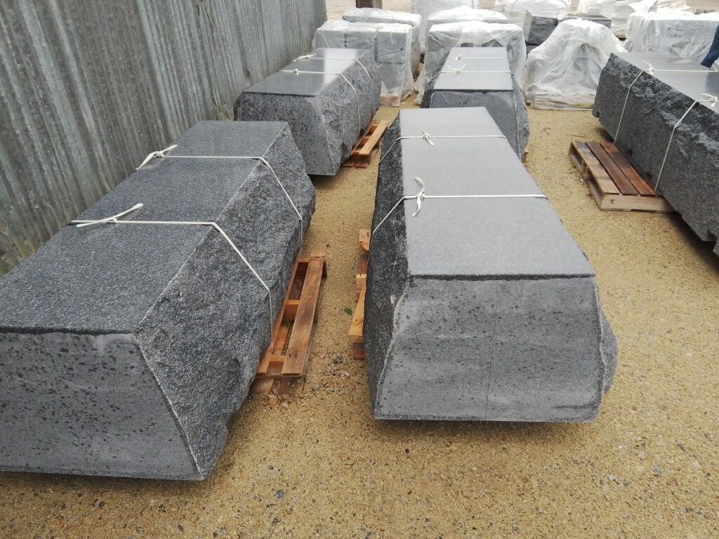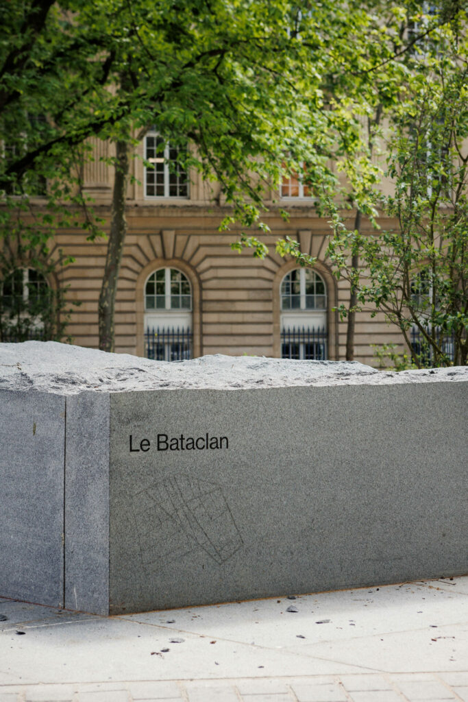 Les blocs de granit ont été travaillés avec précision par les tailleurs de pierre de Bretagne Granit pour la fabrication des stèles gravées aux noms des victimes ainsi que pour le dallage du jardin. Des blocs d’enrochement ont également été laissés bruts pour dessiner le paysage.
